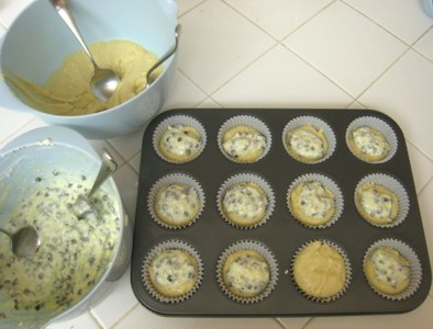 For Chanukah, my mom bought me Clare Crespo's book, Hey There, Cupcake! I tried her vanilla cupcake recipe once, with the kids as assistants, and in my haste, the batter didn't get stirred thoroughly enough from the bottom. The result: so-so cupcakes with sugar crystallized on the top. Then, last week, justJenn posted a home-grown recipe for filled cupcakes that inspired me to try again. Though I haven't eaten many of Jenn's treats, I've had enough - and I trust her artistic and general yuminess instincts enough - to believe her when she describes something as "perfect." I used the same vanilla cupcake recipe as before with Jenn's filling. Actually, I made half a batch as described. Later, when I realized I needed more cupcakes for the dinner party I was attending, I whipped up another batch with the help of Nanette, and this time I substituted mascarpone for the cream cheese (out of necessity). Note to Jenn: it worked great.
