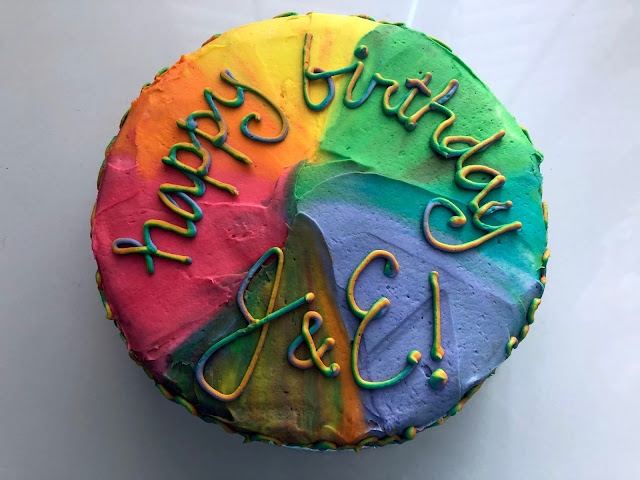 My nephew and niece have birthdays within a few weeks of each other. Last year, we had the chance to celebrate them together when they came down for a visit during quarantine. We had a small family celebration. I wanted to make them something fun and colorful, and somehow between my brainstorming and my kids' ideas, this is what we settled on. They recommended the rainbow effect with the frosting, and I opted to add the multi-colored designs on the side. It was cute and fun for people turning 9 and 12, and we all were so happy to celebrate with them! (We also took a humorously un-scenic hike that led to a view of the 405 Freeway, so at least that gives us something giggle about!)