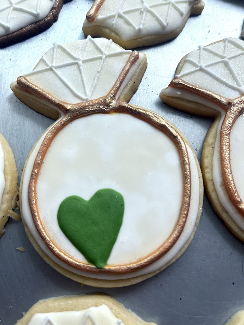 My friend Jennifer asked me to make decorated sugar cookies for her cousin's wedding. They matched the color/theme of the wedding. I made some shaped like a ring and others with their initials, and they were bagged up as favors.